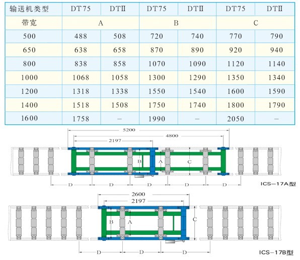17B型双托辊,称重区为17A的1/2,适用于给料距离较短的皮带输送机。