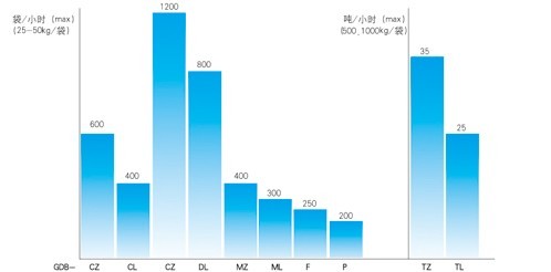 包装能力取决于物料的流动性和包装净重,与人工上袋的熟练程度也相关