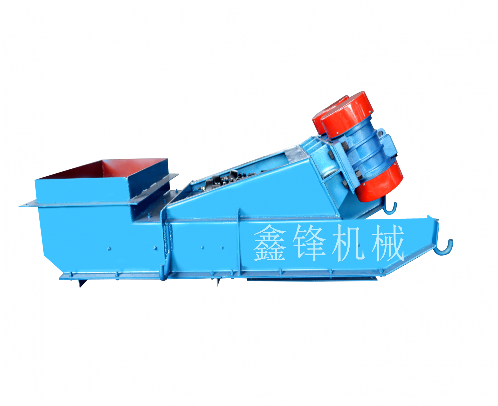 该系列给煤机的给料过程是利用特制的振动电机或两台电动机带动激振器驱动给料槽沿倾斜方向作周期直线往复振动来实现,当给料槽振动的加速度垂直分量大于重力加速度时,槽中的煤被抛起,并按照抛物线的轨迹向前跳跃运动,抛起和下落在瞬间完成,由于激振源的连续激振,给煤槽连续振动,槽中的煤连续向前跳跃,以达到给煤的目的。