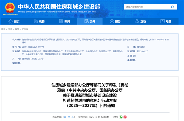近日,住房城乡建设部办公厅等9部门印发《贯彻落实〈中共中央办公厅、国务院办公厅关于推进新型城市基础设施建设打造韧性城市的意见〉行动方案(2025-2027年)》(以下简称《行动方案》),旨在推进数字化、网络化、智能化新型城市基础设施建设,增强城市风险防控和治理能力。