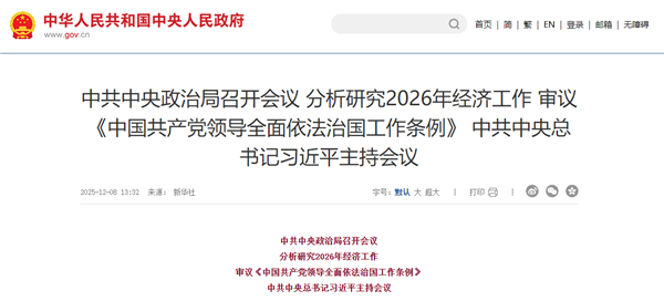 12月8日,中共中央政治局召开会议,分析研究2026年经济工作,审议《中国共产党领导全面依法治国工作条例》。中共中央总书记习近平主持会议。