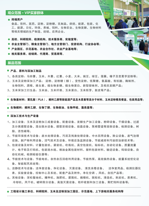 展品范围:包括各类淀粉、玉米及淀粉深加工产品、生物基材料、生物燃料、深加工技术与生产设备,以及工程设计施工单位、科研院所等相关服务机构等。