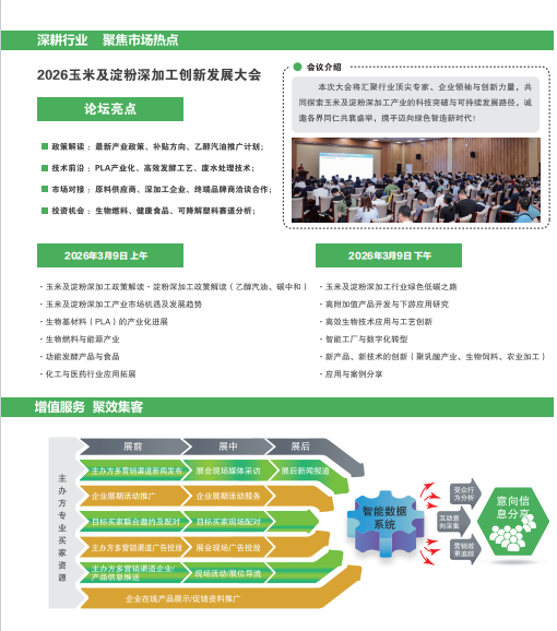 同期活动:举办 2026 中国玉米及淀粉深加工创新发展大会,涵盖政策解读、技术前沿探讨、市场对接、投资机会分析等内容。