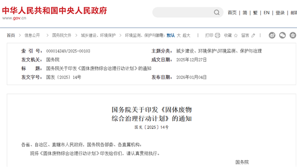 1月4日,国务院印发《固体废物综合治理行动计划》(以下简称《行动计划》),其中明确,到2030年,重点领域固体废物专项整治取得明显成效,固体废物历史堆存量得到有效管控,非法倾倒处置高发态势得到遏制,大宗固体废弃物年综合利用量达到45亿吨,主要再生资源年循环利用量达到5.1亿吨,固体废物综合治理能力和水平显著提升。